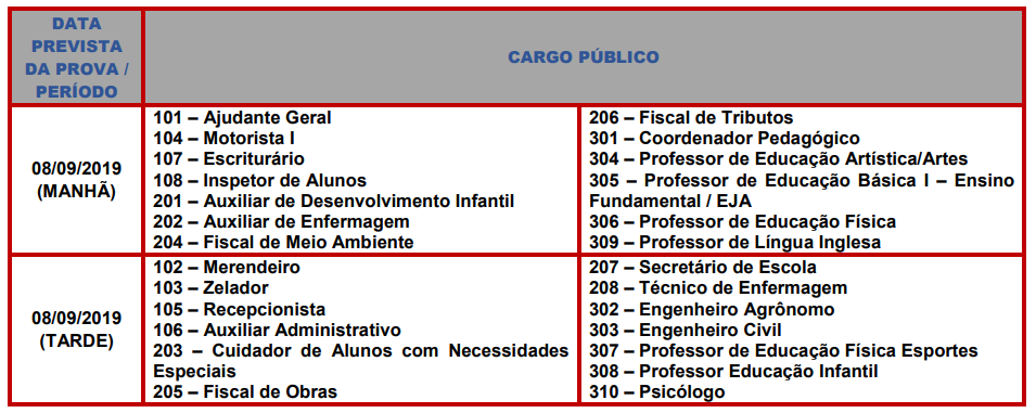 O candidato que desejar concorrer a mais de um cargo deve observar o período em que será aplicada a prova. Confira abaixo: