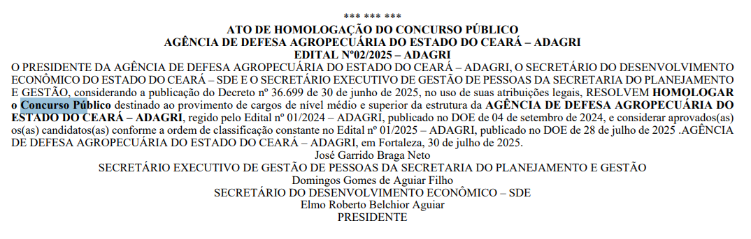 O concurso Adagri CE foi homologado! Segundo a informação publicada no Diário Oficial de Fortaleza, no dia 12 de agosto de 2025, o concurso considera aprovados os candidatos conforme a ordem de classificação do edital.