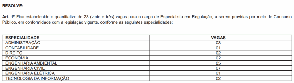 O documento estabelece um total de 23 vagas para o cargo de Especialista em Regulação, distribuídas entre as seguintes especialidades: Administração, Contabilidade, Direito, Economia, Engenharia Ambiental, Engenharia, Engenharia Elétrica e Tecnologia da Informação. Confira a seguir a distribuição das vagas: