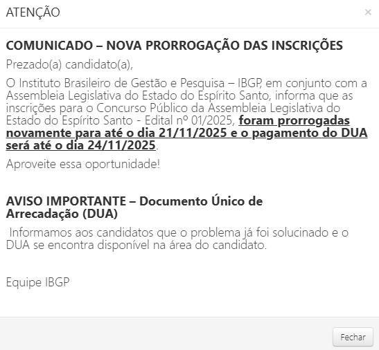 O Instituto Brasileiro De Gestão e Pesquisa – IBGP divulgou uma nova prorrogação do período de inscrição do concurso ALES.