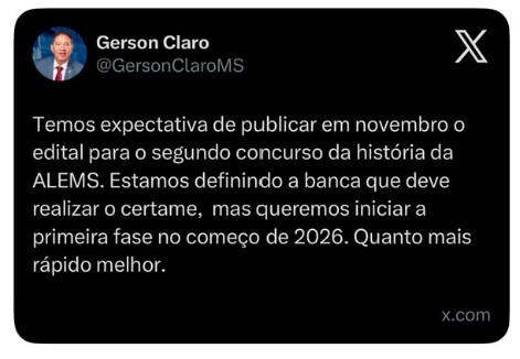 Além disso, de acordo com o Deputado, o concurso ALMS está em fase de definição da banca organizadora responsável pela organização do concurso público.