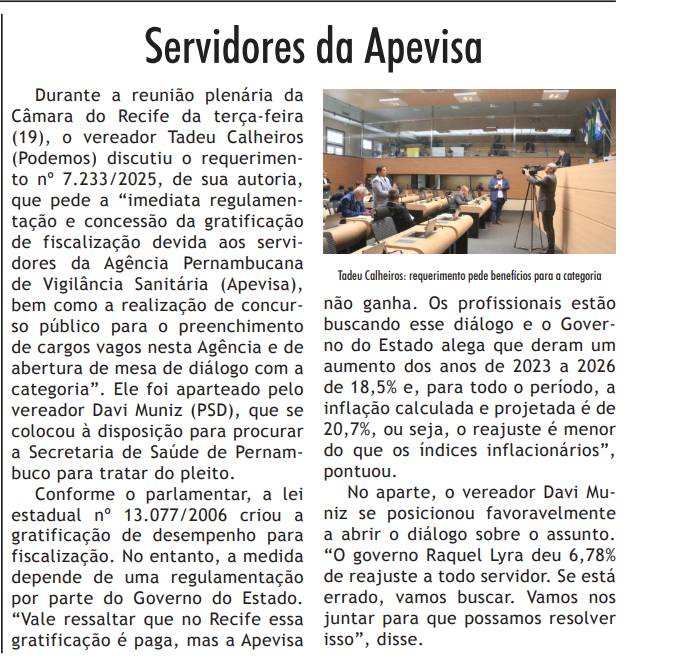 Novidades sobre o Concurso APEVISA! O vereador Tadeu Calheiros solicitou um novo certame para a Agência Pernambucana de Vigilância Sanitária, durante uma reunião plenária da Câmara Municipal do Recife .