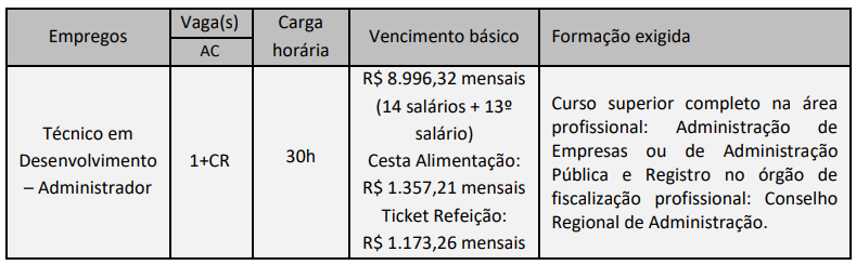 Outra mudança relevante envolve o cargo de Técnico em Desenvolvimento – Administrador. O edital agora exige graduação em Administração de Empresas ou Administração Pública, além de registro ativo no Conselho Regional de Administração (CRA).