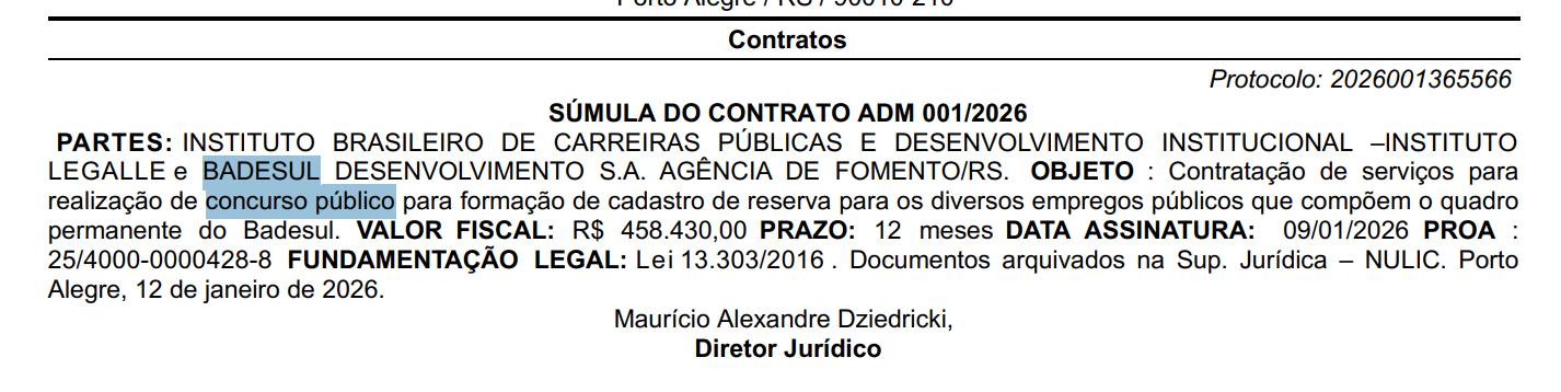 A medida sinaliza avanço nos trâmites do certame, já que a banca passa a conduzir as próximas etapas do processo. Já em 12 de janeiro, foi publicada a súmula de contrato com a banca. Com isso, informações de cargos e vagas devem ser publicadas em breve.