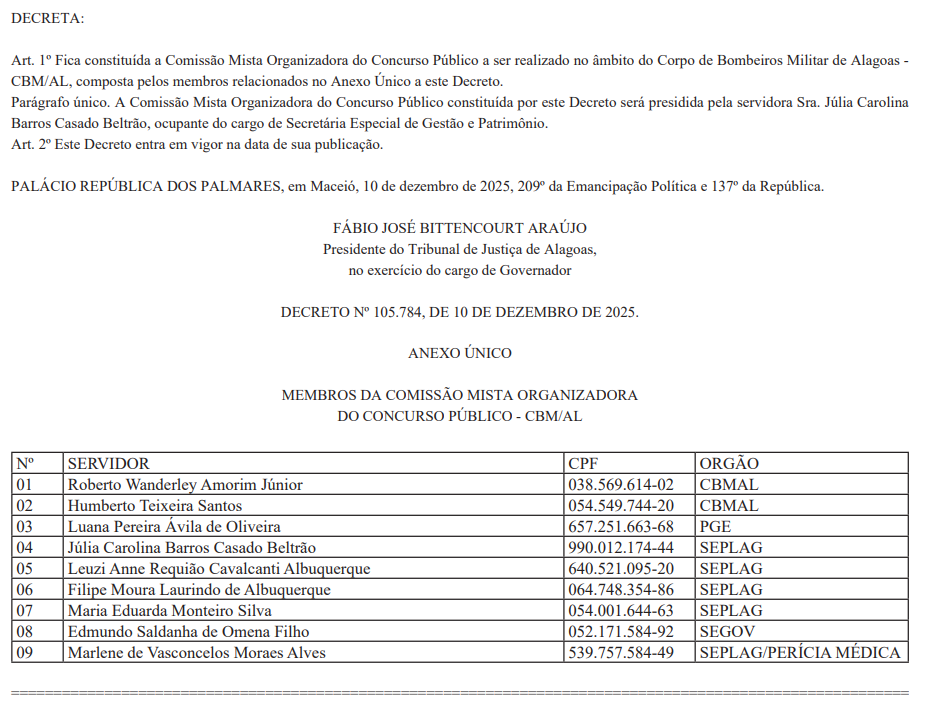 A nova comissão organizadora é composta por membros de diferentes órgãos, como o próprio CBMAL, a Secretaria de Estado do Planejamento, Gestão e Patrimônio (SEPLAG) e a Procuradoria Geral do Estado (PGE). Esse time de especialistas terá a missão de coordenar todos os preparativos do certame, o que inclui etapas cruciais como a escolha da banca e a definição das regras do edital. A criação desse grupo é um forte indicativo de que o concurso avança para as próximas fases. Confira o documento completo.
