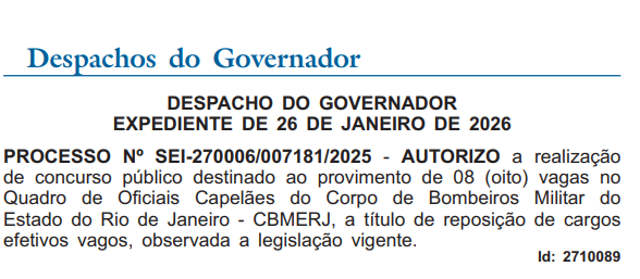 O concurso Bombeiros RJ Oficial Capelão foi autorizado, concurseiro! Em 27 de janeiro de 2026, o Corpo de Bombeiros Militar do Estado do Rio de Janeiro (CBMERJ) teve a autorização de 8 vagas para Oficial Capelão autorizadas pelo governador no Diário Oficial do Estado.