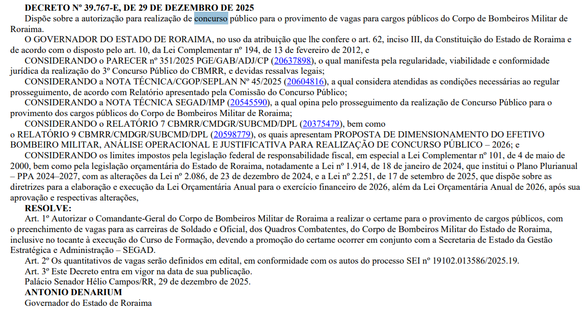- 07/01/2026: Autorização do concurso publicada no DOE-RR