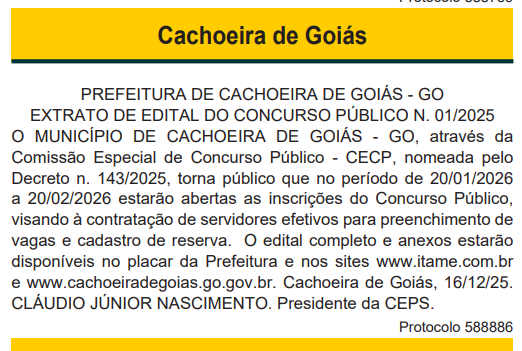 | Clique aqui para ver o edital Cachoeira Goiás GO | |