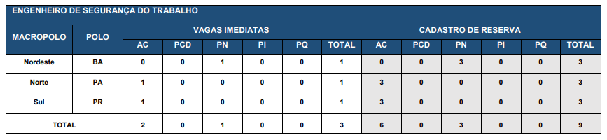 | Engenheiro de Segurança do Trabalho | 3 | 9 | 12 |