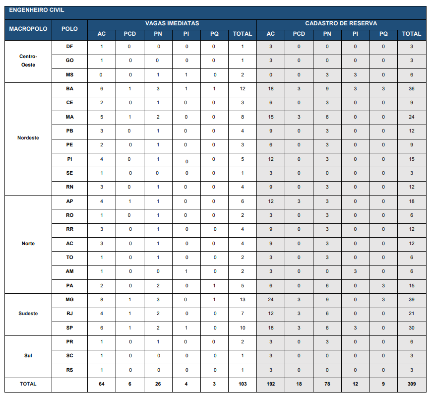 As vagas contemplam diferentes polos de atuação em todo o país, conforme a necessidade da instituição.