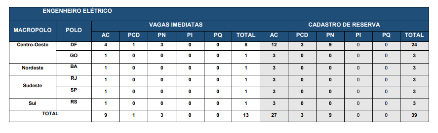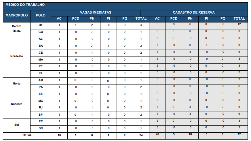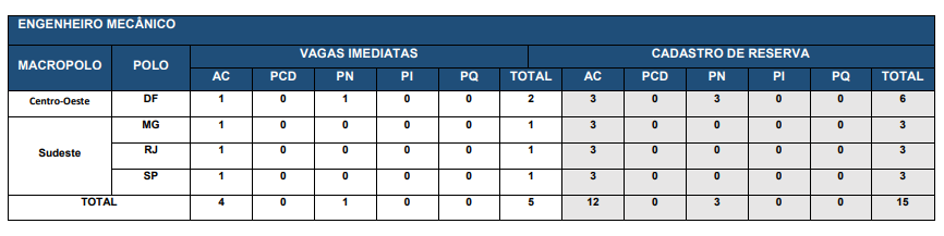 | Cargo | Vagas Imediatas | Cadastro de Reserva | Total Geral |