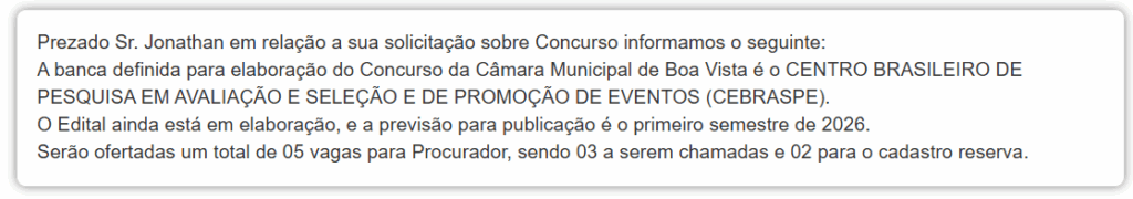 Novidades sobre o concurso Câmara Boa Vista RR! Em contato com a equipe do GRAN, a assessoria da Câmara Municipal de Boa Vista RR informou que o edital está em elaboração, com previsão de publicação no primeiro semestre de 2026.