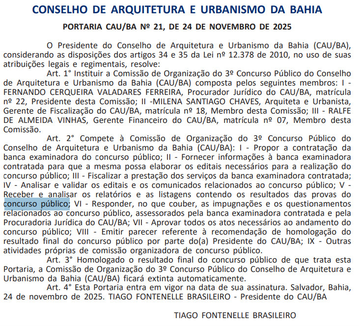 O Conselho de Arquitetura e Urbanismo da Bahia institui a comissão para conduzir todas as etapas do 3° certame, ela será responsável por propor a banca examinadora, fornecer informações para elaboração dos editais, fiscalizar os serviços contratados, analisar editais, comunicados e resultados, responder questionamentos e impugnações e emitir parecer para homologação do resultado final. Veja o documento na íntegra