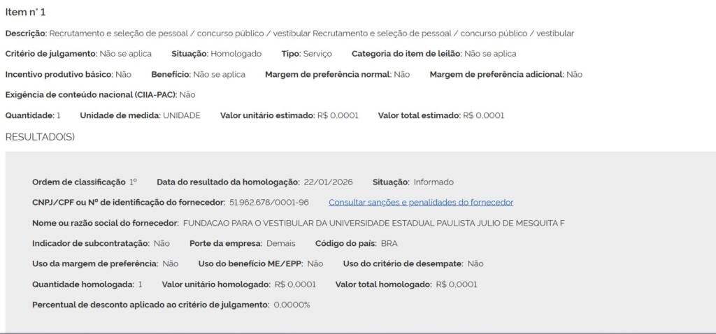 A empresa selecionada, conforme consta no resultado da homologação, é a Fundação para o Vestibular da Universidade Estadual Paulista Júlio de Mesquita Filho (Vunesp).