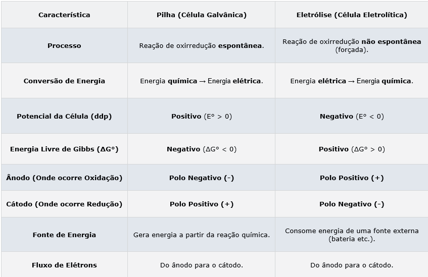 Regra de Ouro: Ânodo = oxida (perde e–) | Cátodo = reduz (ganha e–). Lembre-se: ânodo é o polo negativo e perde massa, cátodo é o polo positivo e ganha massa na pilha. E°pilha (ddp) = E°cátodo – E°ânodo. Se positivo reação espontânea (pilha). Se negativo não espontânea (eletrólise). ΔG° = –nFE°. Memorize: F = 96.500 C/mol, n = nº de elétrons, E° = ddp, será espontânea se ΔG° < 0.