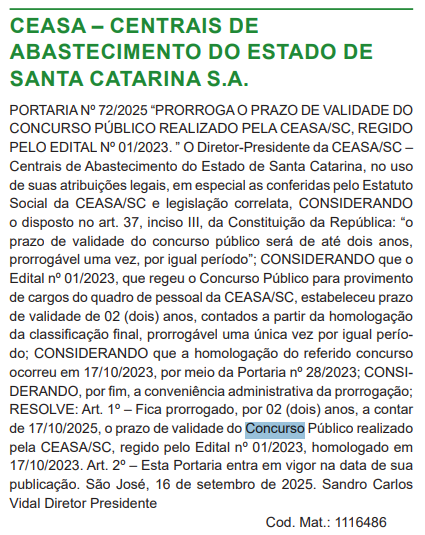 Em nova atualização, publicada em 16 de setembro de 2025, foi autorizada a prorrogação da validade do edital 2023 por mais 2 anos, valendo a partir de 17 de outubro de 2025.