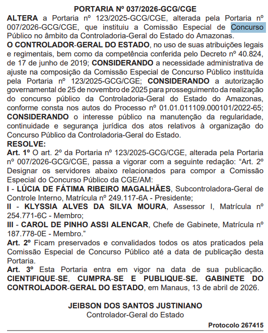 Vale destacar que, no dia 15 de abril de 2026, a Controladoria Geral do Estado do Amazonas (CGE AM) passou por uma alteração na composição dos membros da comissão organizadora especial. Veja em “situação atual”.