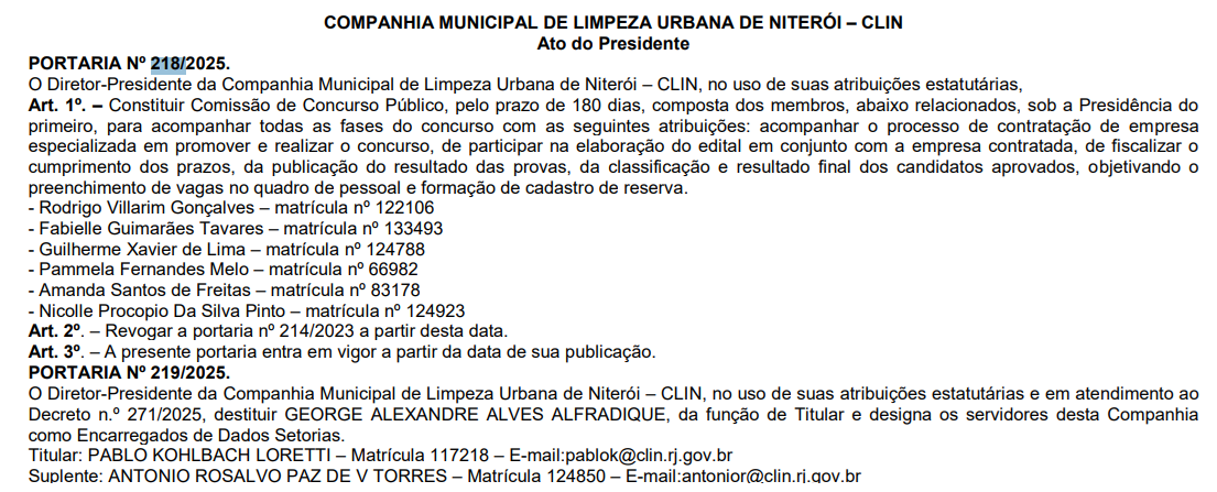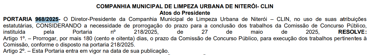 Novidades sobre o Concurso CLIN Niterói RJ! A comissão organizadora responsável pelo próximo concurso da Companhia de Limpeza de Niterói, formada em maio, teve prazo prorrogado por mais 180 dias para concluir os trabalhos da execução do certame.