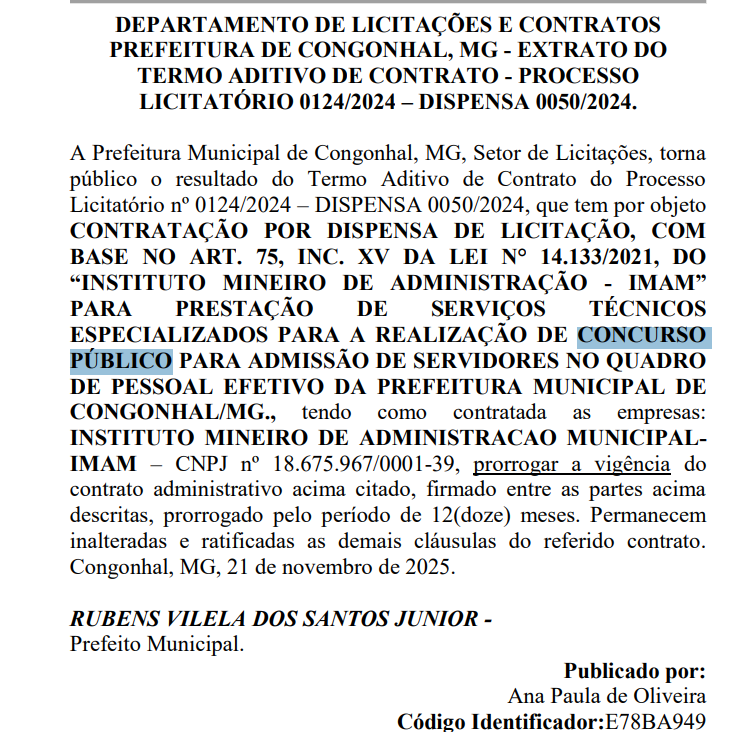O extrato do termo aditivo do contrato foi publicado no dia 2 de dezembro de 2025, por meio de dispensa de licitação.