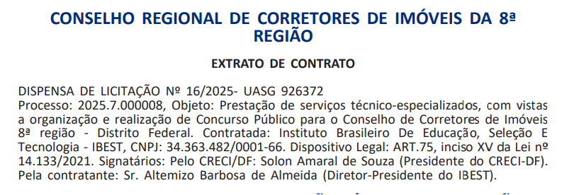 O concurso CRECI DF está confirmado! Em 4 de novembro de 2025, foi contratada a banca organizadora responsável pelo novo edital do Conselho Regional de Corretores de Imóveis da 8ª região.