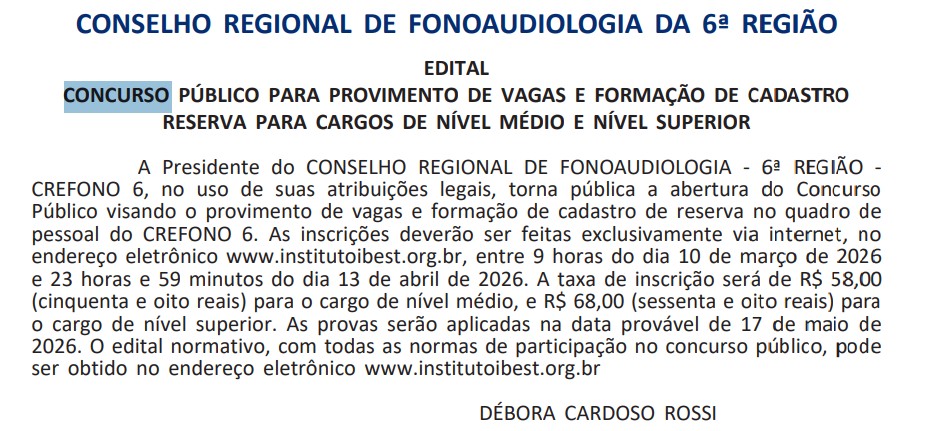 A espera acabou: o extrato de edital CREFONO 6 acaba de ser publicado para o  Conselho Regional de Fonoaudiologia da 6ª Região (Minas Gerais, Espírito Santo, Goiás, Mato Grosso e Mato Grosso do Sul). Para garantir a sua participação, é fundamental ficar atento ao cronograma oficial. As inscrições estarão abertas entre os dias 10/03/2026 e 13/04/2026. Portanto, os interessados devem realizar o cadastro dentro deste período.