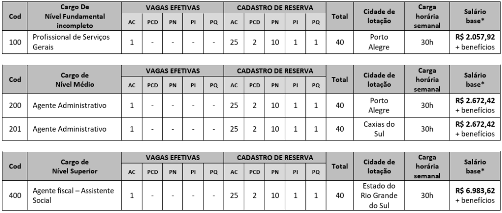 As oportunidades estão distribuídas para a sede em Porto Alegre e seccionais no interior, com carga horária de 30 horas semanais para todos os cargos.
