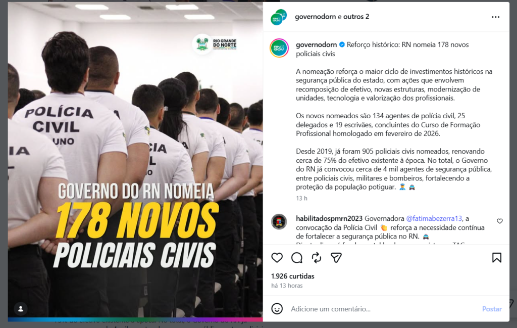 Os novos integrantes da segurança pública potiguar são concluintes do Curso de Formação Profissional, que foi homologado em fevereiro de 2026. Essa movimentação reforça o compromisso do estado em recompor o quadro diretivo da polícia judiciária. Confira a publicação: