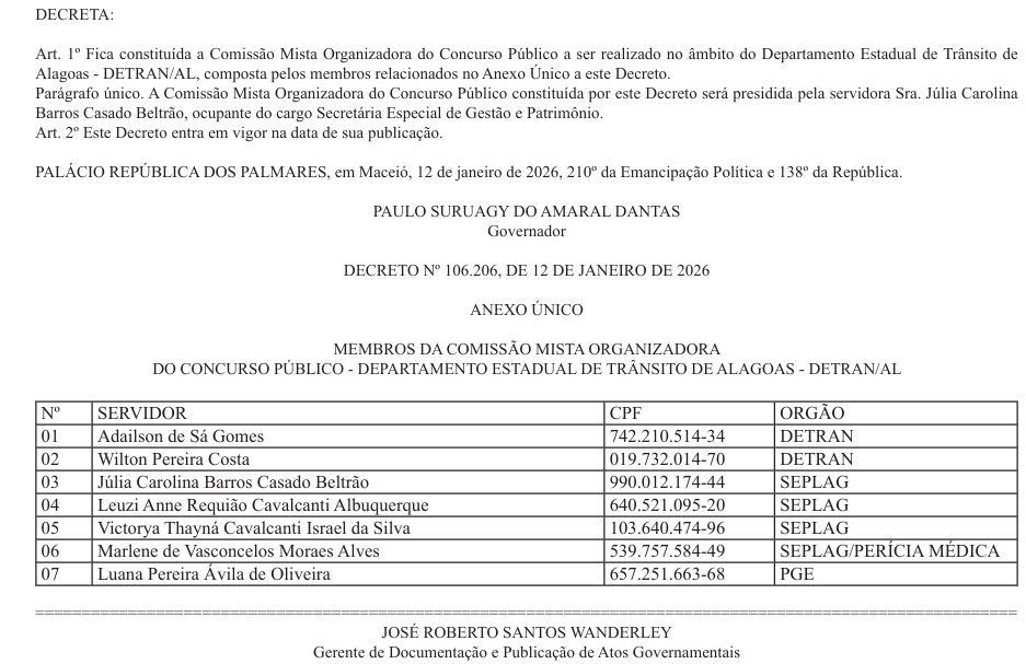 Formada comissão do Concurso Detran AL! O Governo de Alagoas deu um passo decisivo para a realização do novo concurso público do Departamento Estadual de Trânsito de Alagoas (DETRAN/AL). Foi publicado em 12 de janeiro de 2026, o decreto que oficializa a constituição da Comissão Mista Organizadora do certame.