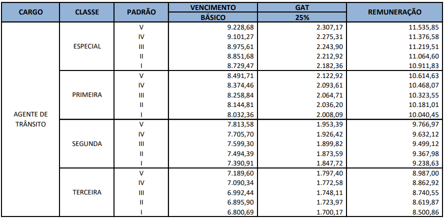 Veja a seguir a tabela detalhada com os vencimentos referentes ao cargo de Agente: