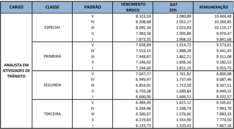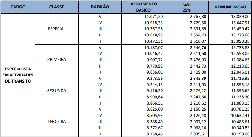 | Cargos | Especialista em Atividades de Trânsito, Analista em Atividades de Trânsito, Técnico em Atividades de Trânsito e Agente de Trânsito |