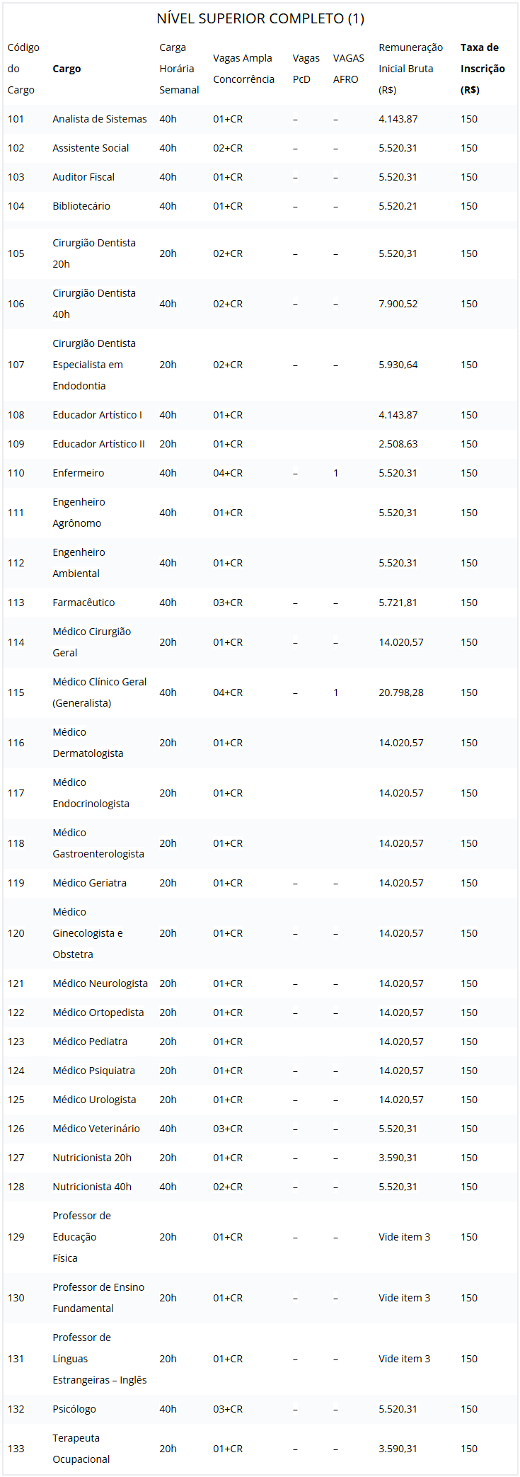 (1) *CR = Cadastro de reserva é o conjunto de candidatos aprovados que tenham obtido classificação além do número de vagas oferecido por cargo.