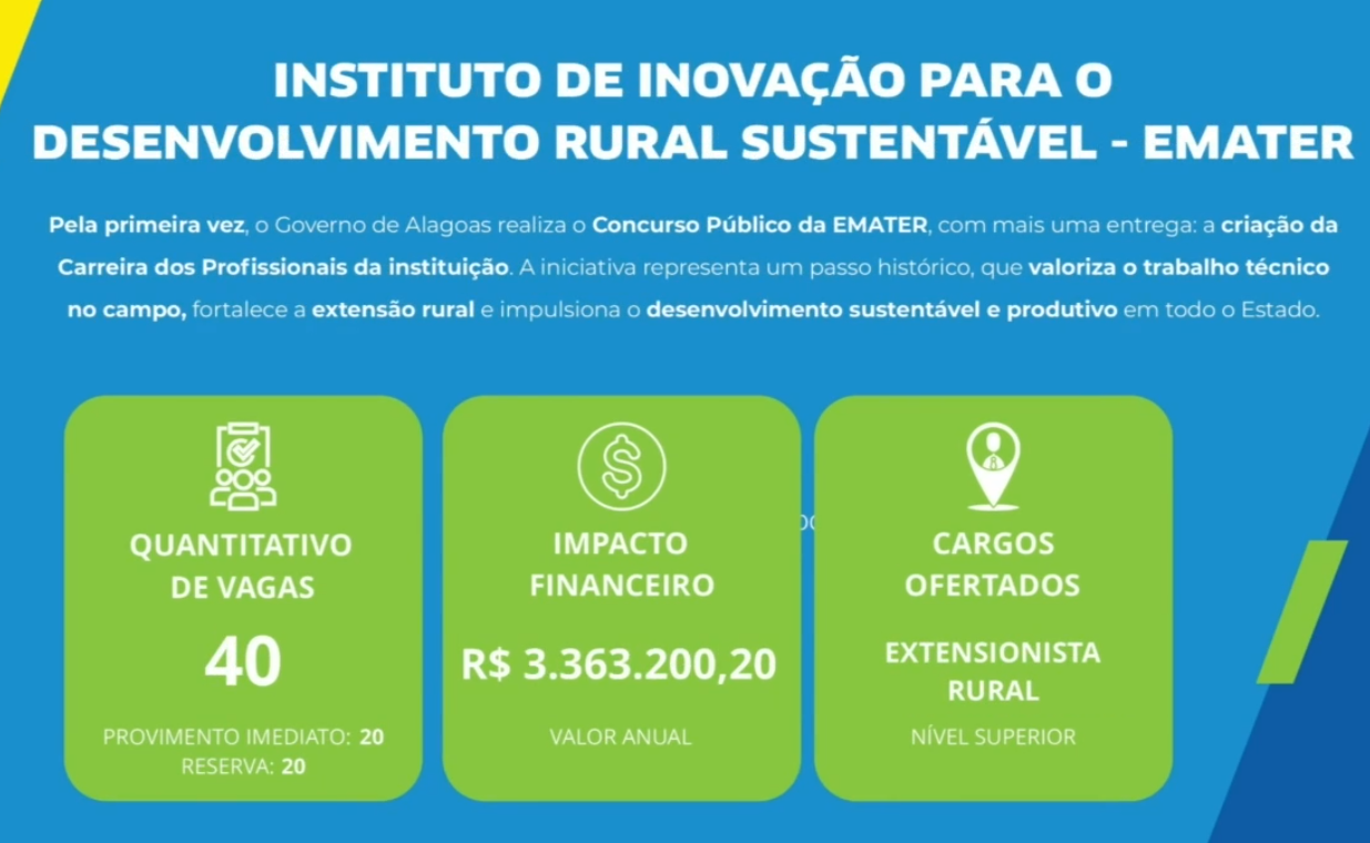 O Concurso Emater AL acontecerá em breve! Isso porque foram anunciadas 20 vagas imediatas mais 20 vagas para formação de cadastro reserva no cargo de Extensionista rural de nível superior. Vale destacar que a Empresa de Assistência Técnica e Extensão Rural do Alagoas não realiza concurso público há mais de 30 anos.