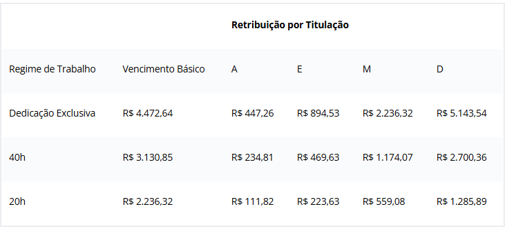 A remuneração inicial do cargo de Professor é composta pela soma do Vencimento Básico e Retribuição por Titulação
