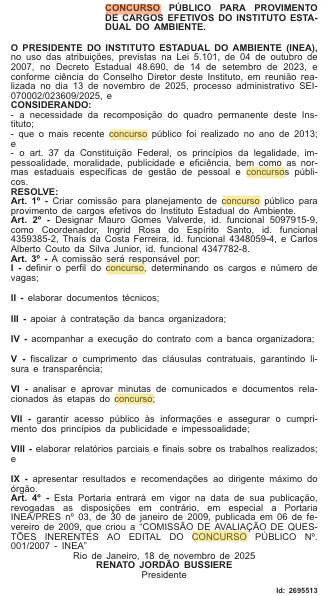 Atualizações sobre o Concurso INEA RJ! O Instituto Estadual do Ambiente instituiu a comissão responsável pelo planejamento do novo concurso público do órgão.