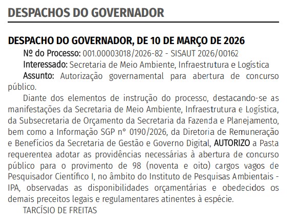 A autorização governamental foi concedida para o provimento de cargos vagos visando fortalecer as atividades de pesquisa e preservação do Estado. O Instituto de Pesquisa Ambiental (IPA), que unifica antigos institutos (Botânica, Geológico e Florestal), agora tem sinal verde para seguir com os trâmites administrativos necessários.