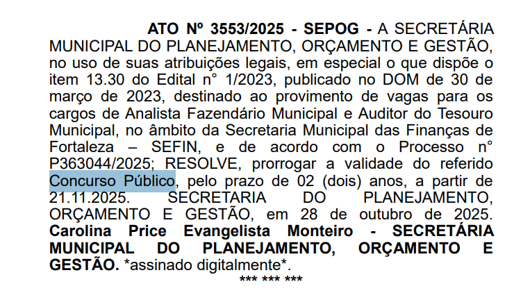 O Concurso ISS Fortaleza CE está com edital prorrogado por mais dois anos. A medida foi publicada em 29 de outubro de 2025. A Prefeitura do Município visou o provimento de 50 vagas para cargos de nível superior: são 30 vagas para Analista Fazendário Municipal e 20 vagas para Auditor do Tesouro Municipal.