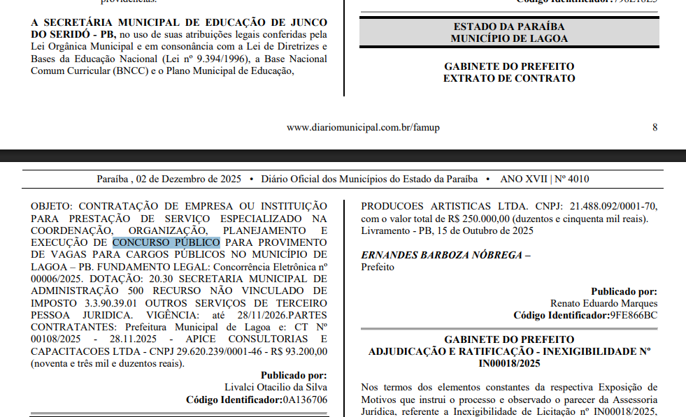 A banca organizadora do concurso Lagoa PB foi oficialmente definida! A escolhida para realizar o planejamento, organização e execução de todas as etapas do certame foi a Ápice Consultorias e Capacitações Ltda.