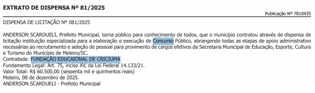 Segundo o documento publicado, o contrato da Prefeitura Municipal com a banca foi definido por meio de dispensa de licitação. As oportunidades serão para provimento de cargos efetivos da Secretaria Municipal de Educação, Esporte, Cultura e Turismo do Município de Meleiro/SC.