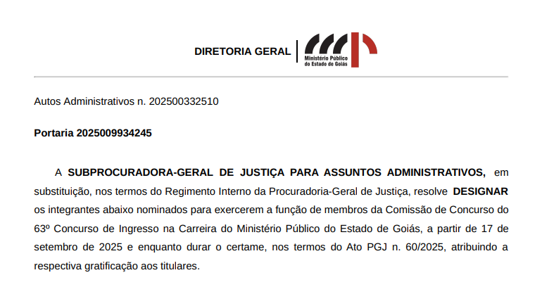 No dia 17 de setembro de 2025, conforme documento oficial a comissão do concurso MP GO Promotor está formada. Os nominados são Procuradoras e Procuradores, Promotoras e Promotores, Representantes do Tribunal de Justiça do Estado de Goiás e Representantes da Ordem dos Advogados do Brasil.