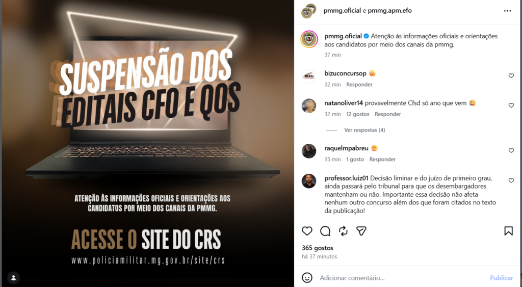 Segundo a ata de suspensão, os candidatos devem acompanhar as próximas atualizações pelos canais oficiais da PMMG e do CRS/DRH. A orientação vale para os inscritos nos dois certames.