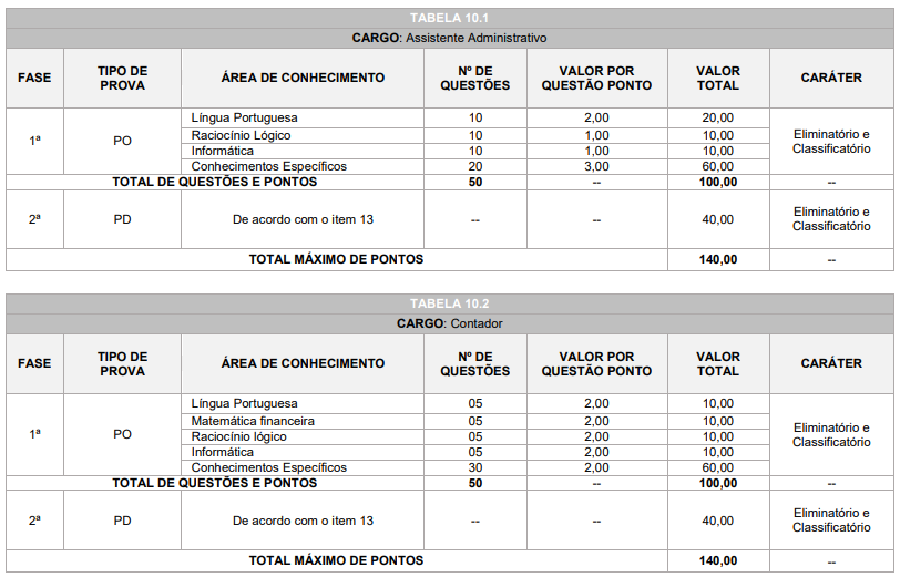 A prova discursiva, de caráter eliminatório e classificatório, será aplicada para os cargos de Assistente Administrativo e Contador.