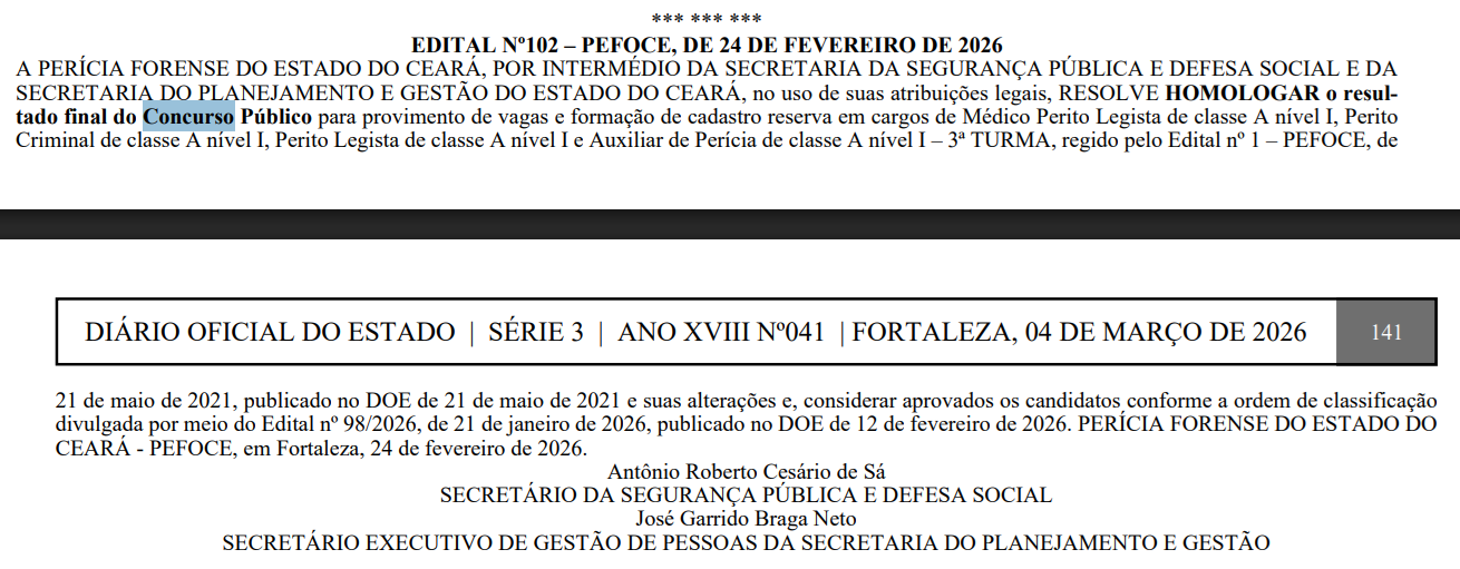 Novidades sobre o concurso PEFOCE! Em 24 de fevereiro, a Assembleia Legislativa do Estado do Ceará (Alece) autorizou a criação de 8 novos cargos para Perito Criminal na Perícia Forense do Estado do Ceará.