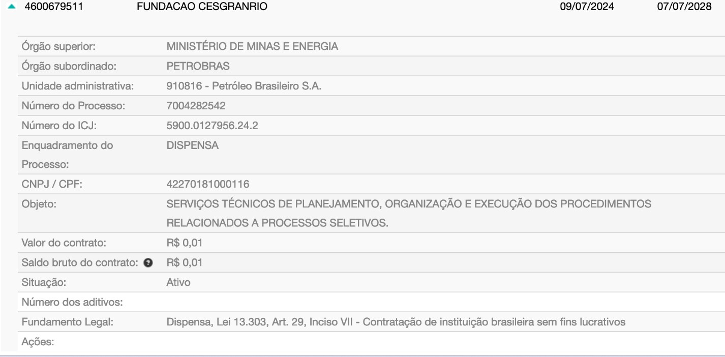 Aqui você pode ver o print do documento com a contratação da Fundação Cesgranrio como banca organizadora do novo concurso Petrobras. Clique AQUI!