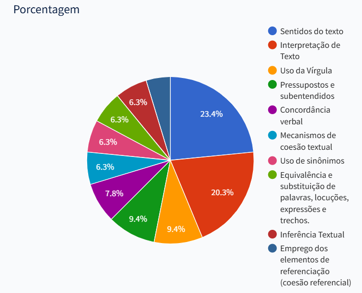 - Interpretação de Texto (20,3%): Somada aos sentidos, a interpretação pura domina quase metade da prova.