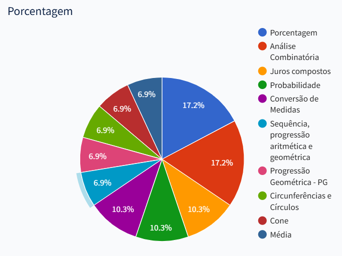 - Sequências, PA e PG (6,9% cada): Progressões costumam aparecer em questões que exigem a identificação de padrões lógicos.