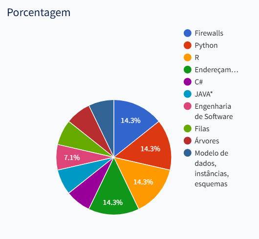 - Bancos de Dados e Engenharia: Temas como Modelo de Dados (7,1%) e Engenharia de Software (7,1%) completam a base necessária para o desenvolvimento de soluções robustas.