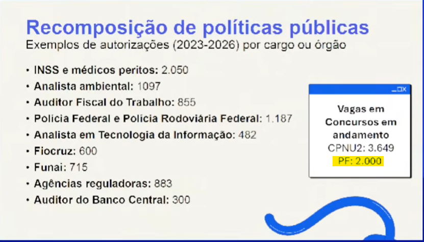 A medida se soma às 1.000 vagas imediatas autorizadas, totalizando 2.000 novos servidores na Polícia Federal. A fala confirma o planejamento de reforço no quadro da corporação e indica avanço no aproveitamento de aprovados além das vagas iniciais.