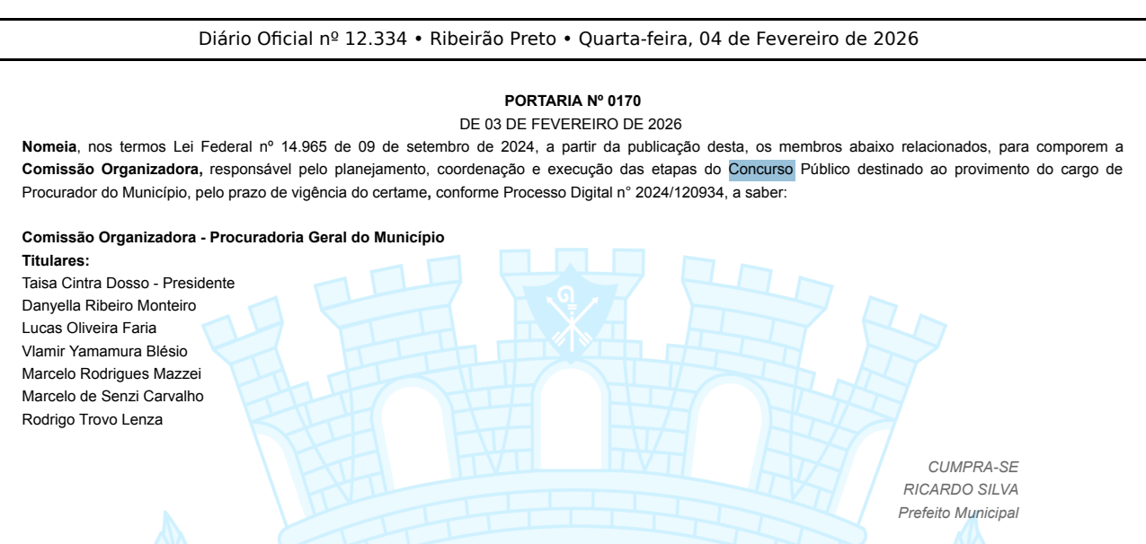 Novidade importante sobre o Concurso PGM Ribeirão Preto SP! Em 4 de fevereiro de 2026, foi formada a comissão responsável pelo novo edital da Procuradoria Geral do Município de Ribeirão Preto, em São Paulo.