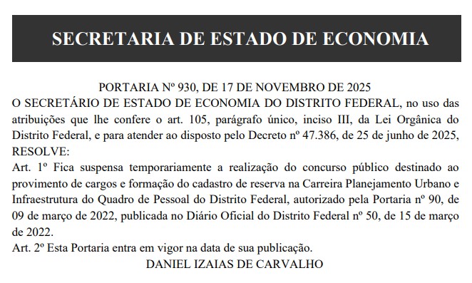 Vale destacar que está suspensa temporariamente a realização do concurso público destinado ao provimento de cargos e formação do cadastro de reserva na Carreira Planejamento Urbano e Infraestrutura do Quadro de Pessoal do Distrito Federal, confira o documento na íntegra em “situação atual”.