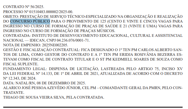 O contrato com a banca foi oficialmente publicado, nesta quarta-feira, 10 de dezembro de 2025, no Diário Oficial do Estado. Confira a publicação na íntegra.
